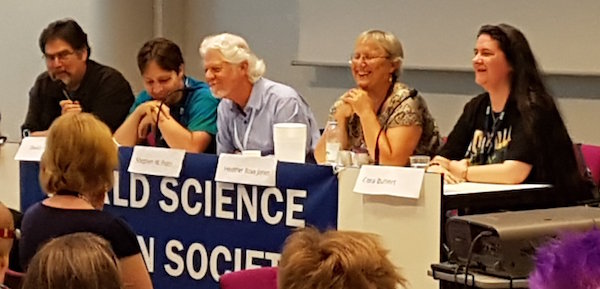 Since the panel slot ran until 7:30 (though it gets out a little earlier) and the Hugo ceremonies were scheduled to begin at 7:30, I'd lost all chance of meeting up to sit with any of my default groups. And though I scanned the bleachers for quite a while looking for a seat, I couldn't find anyone until I'd given up and went off to sit by myself and then ran into Kathryn Sullivan who I'd been chatting with in several contexts over the several previous days. So that was nice. The ceremony was very enjoyable and fortunately this year there wasn't any anxiety that the atmosphere would be hijacked by Puppy hijinx. (If you don't know what I'm talking about, don't worry about it.)